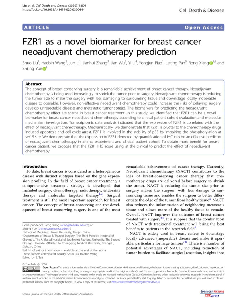 近日,万象城awc官网登录入口附属医院(成都市第三人民医院)乳腺甲状腺外科副主任医师王浩斌博士课题组与南开大学万象城awc官网登录入口副教授岳世静博士课题组在Nature出版集团旗下细胞生物学权威期刊《Cell Death & Disease》(影响因子:6.304,JCR2区)在线发表题为《FZR1 as a novel biomarker for breast cancer neoadjuvant chemotherapy prediction》的合作研究论文,在寻找乳腺癌新辅助化疗疗效预测指标上取得重要进展。