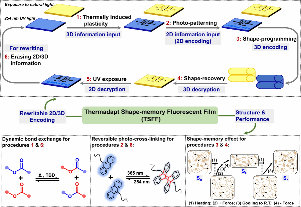该研究工作将光致动态性和热致动态性引入到形状记忆高分子材料的分子结构设计之中,实现了二维荧光图案和三维图案的加密与重构,为信息防伪高分子材料的设计提供了思路。此外,该研究工作还为团队正在开展的智能生物材料的动态化构建提供了参考,特别是为自适应组织工程支架和可适形生物电子等提供了设计策略。