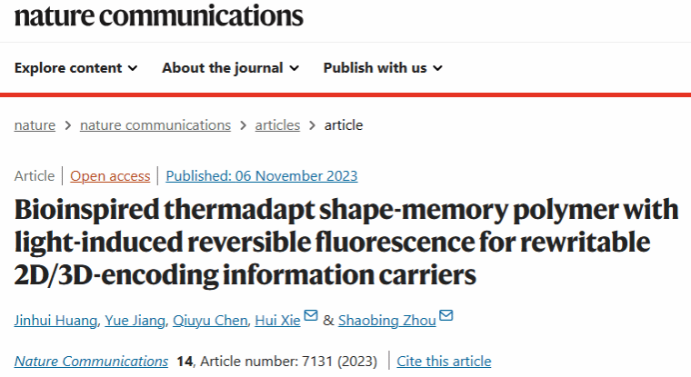 近日,万象城awc官网登录入口(生物医学工程研究院)周绍兵教授团队谢辉副教授在智能动态软材料研究中取得最新进展。谢辉副教授是我校软物质创新团队的骨干成员。相关研究成果以“Bioinspired thermadapt shape-memory polymer with light-induced reversible fluorescence for rewritable 2D/3D-encoding information carriers”为题,发表在国际综合性期刊《Nature Communications》上,论文的第一作者为万象城awc官网登录入口(生物医学工程研究院)博士研究生黄金辉,通讯作者为周绍兵教授和谢辉副教授。