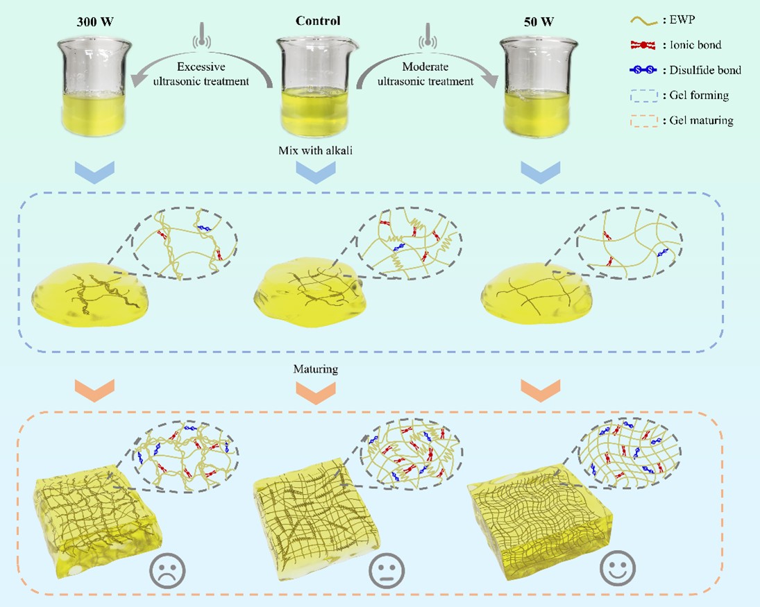 皮蛋是我国一种历史悠久的传统食品,以其独特的风味和丰富的营养而广受欢迎。为了提升传统皮蛋的品质,研究人员提出了许多改进方案,然而改进后的皮蛋容易出现蛋清凝胶强度不足的问题。超声波作为一种耗能较低、操作简单、环境友好的加工技术,在食品加工领域应用广泛。通过超声处理可以在一定程度上影响蛋清蛋白结构,调控凝胶网络的形成,这一特性对于改善碱诱导蛋清蛋白凝胶性质具有重要意义。