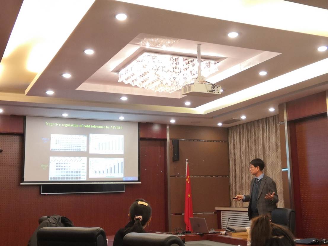 2019年12月25日下午,韩国庆尚国立大学郑雨植教授应Beat365中文官方网站邀请,在行政楼201会议室作了题为《Regulation of Freezing Tolerance by a Mitogen-Activated Protein Kinase in Plant》的报告,本次报告是Beat365中文官方网站——Beat365中文官方网站“活力生命”论坛第18讲,Beat365中文官方网站党委书记薛冰、副院长常诚及学院师生40余人参加了报告会,副院长许元红教授主持报告会。