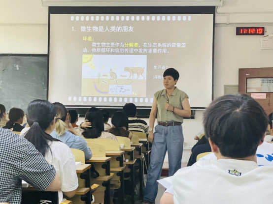 秋高气爽,天空湛蓝。9月4日上午,Beat365中文官方网站党委书记薛冰、院长许元红、副书记张雪蕾、副院长孙海新、院长助理丁晓腾及学院教科办工作人员一同来到博学楼203,听取了学院生物技术系主任王超老师为21巴斯德班及21生物班讲授的《微生物学》。王老师的授课内容涵盖了微生物在食品、生物工程等各领域的应用,在授课过程中,充分展现了自己的专业素养,以生动的讲解和丰富的实例吸引了学生的注意力。