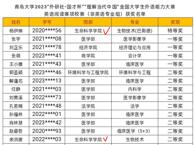 10月14日,由我校公共外语教育学院承办的2023“外研社·国才杯”“理解当代中国”全国大学生外语能力大赛英语阅读赛项校赛(非英语专业组)圆满落幕。经过激烈角逐,Beat365官网2020级生物技术(巴斯德班)杨伊琳同学脱颖而出,凭借扎实的英语功底,强大的思维能力,过关斩将,荣获本次比赛特等奖,并代表学校晋级参加山东省决赛;2022级生物技术1班余洪建同学荣获本次比赛二等奖。