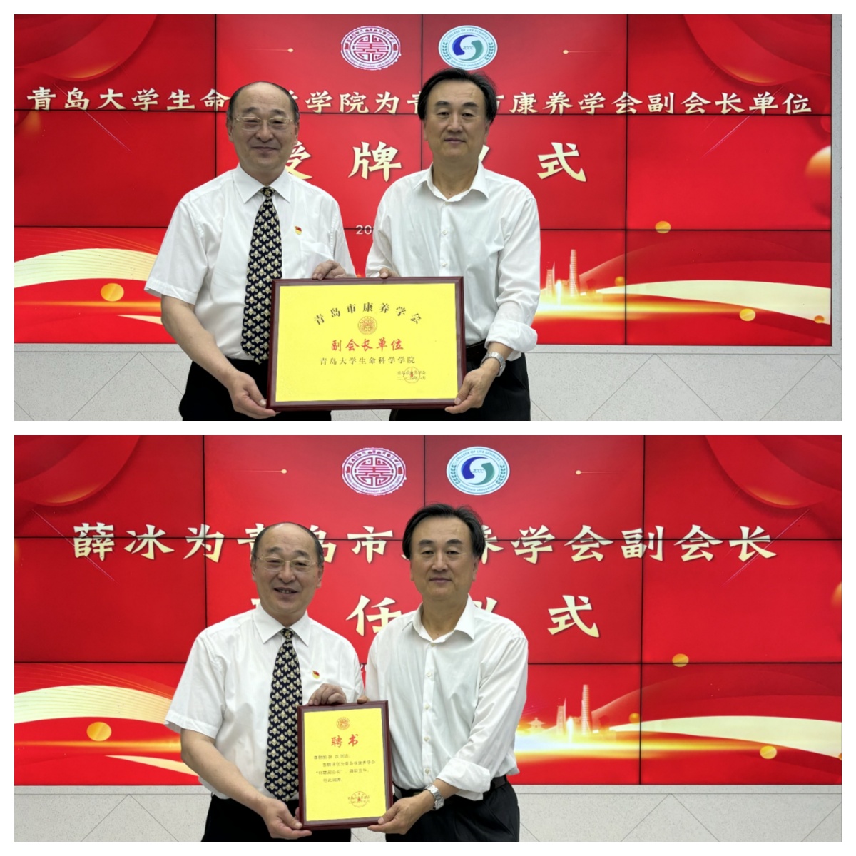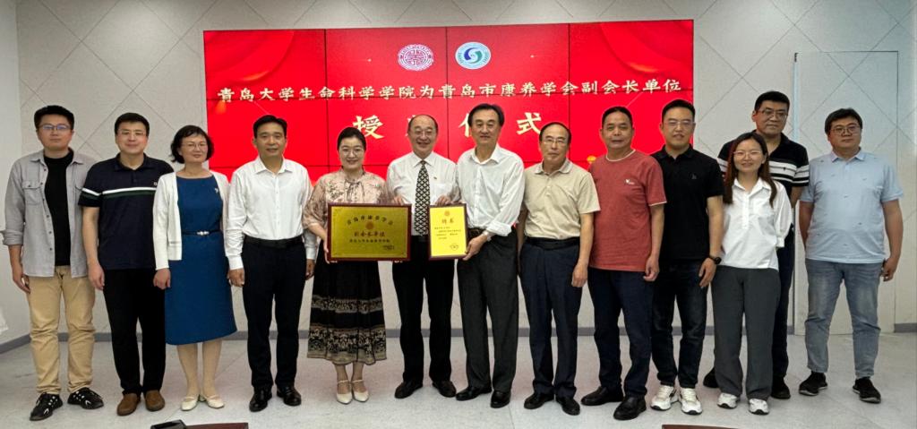 仪式上,青岛市康养学会王中会长为Beat365中文官方网站授予“青岛市康养学会副会长单位”,Beat365中文官方网站党委书记薛冰受聘为青岛市康养学会特聘副会长。
