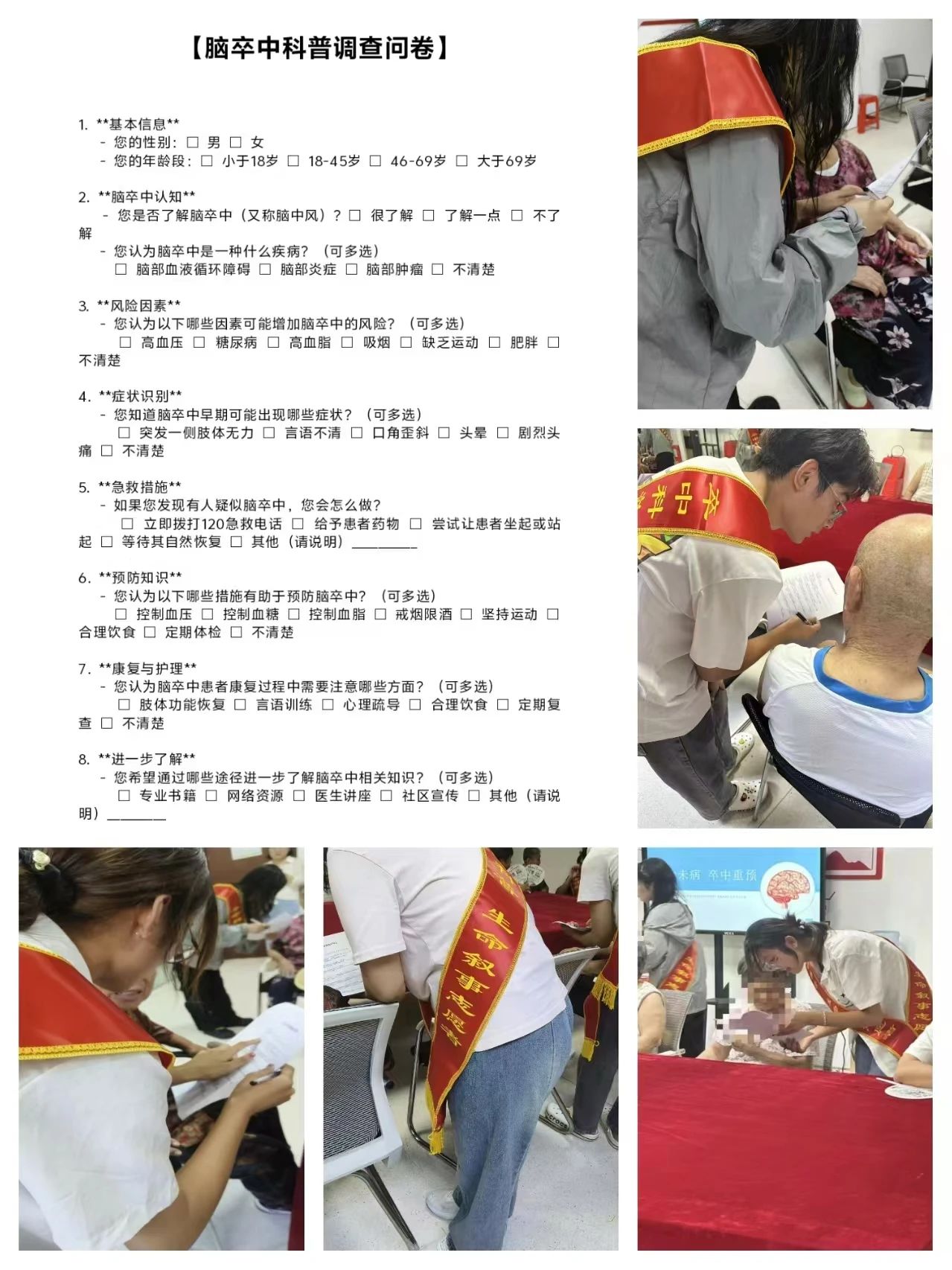 首先,为保证不影响老年人的正常生活,更好完成卒中科普的初衷,实践团成员在齐河九和城康养中心接待处进行了培训活动并签订培训协议。稍后,开始宣传活动,积极鼓舞老年人参与听讲,宣传过程中,爷爷奶奶们表现出对实践团成员的到来的热烈欢迎,并投露出对新知识的好奇,接着成员们协助养老院负责人帮助腿脚不方便的老年人入座,向老年人说明今天的活动流程。为了进一步提升科普效果,实践团特别制作了宣传单,宣传单内容涵盖了脑卒中的基础知识、危险因素、预防措施、急救流程、康复指导等多个方面,易于理解。各位队员分别发放宣传单,考虑到老年人眼花识字不清晰的情况,队员们将问卷问题一对一的讲解,确保每位拿到宣传单的老年人都能真正读懂、会用。