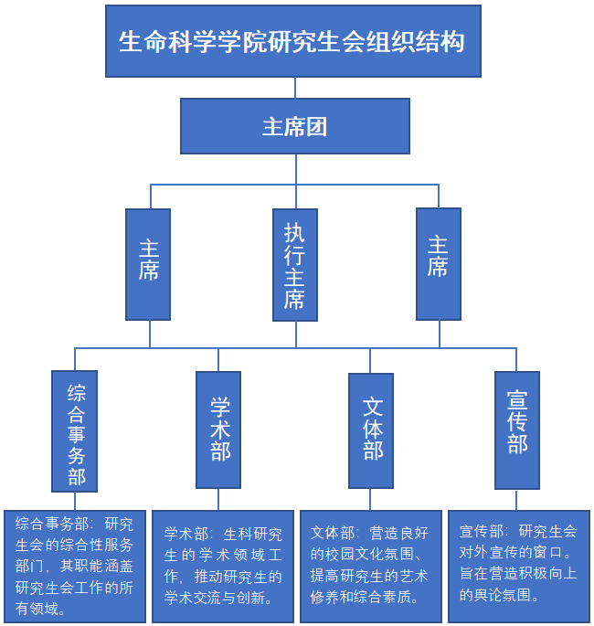 当前,学院研究生会下辖综合事务部、学术部、文体部、宣传部、党建中心等5个部门,内部组织结构科学合理,各部门之间紧密联系、有条不紊、协调高效地开展工作,进一步加强了研会在研究生中的影响力和凝聚力。通过与兄弟学院研究生会的精品活动联合推广等方法,增进合作深度,共同服务学生成长成才。制定各类管理办法,有效推进校研究生会工作,提高了活动组织的效率以及在研究生中的认可度。