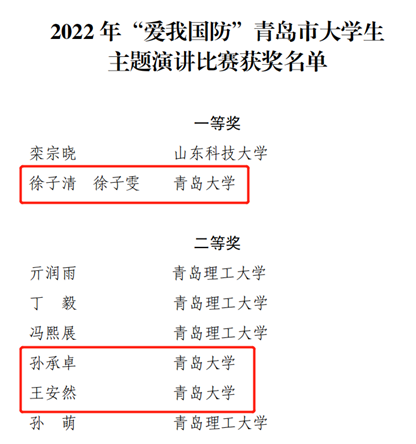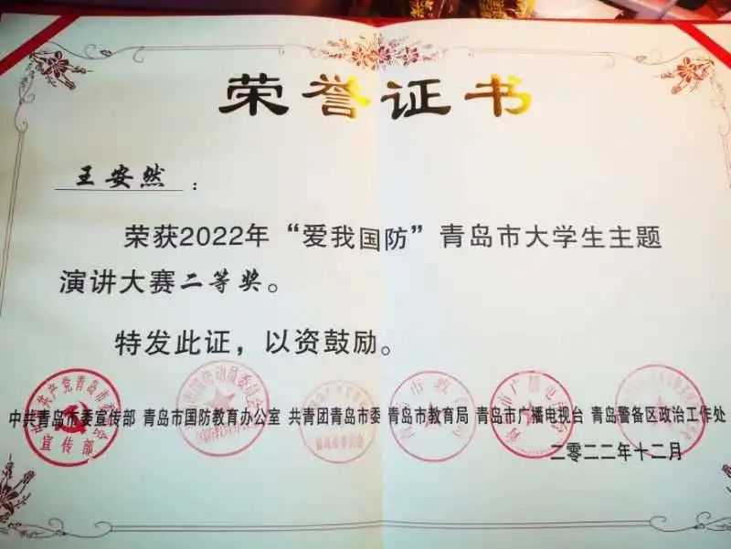 近日,从青岛市国防教育办公室传来喜讯,Beat365官网2020级食品科学与工程专业王安然同学在2022年度“爱我国防”青岛市大学生主题演讲比赛中获得二等奖的优异成绩。