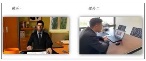 3)请提前准备好两个会议账号,分别命名为“姓名+一机位”和“姓名+二机位”,准备好拍摄位置及支架等,复试前按要求安装调试好设备。考生端两台设备开启摄像头,电脑自带摄像头对准考生本人,另一部电脑或手机摄像头从考生后方成45度拍摄,要保证考生考试屏幕能清晰地被复试小组看到,见附图: