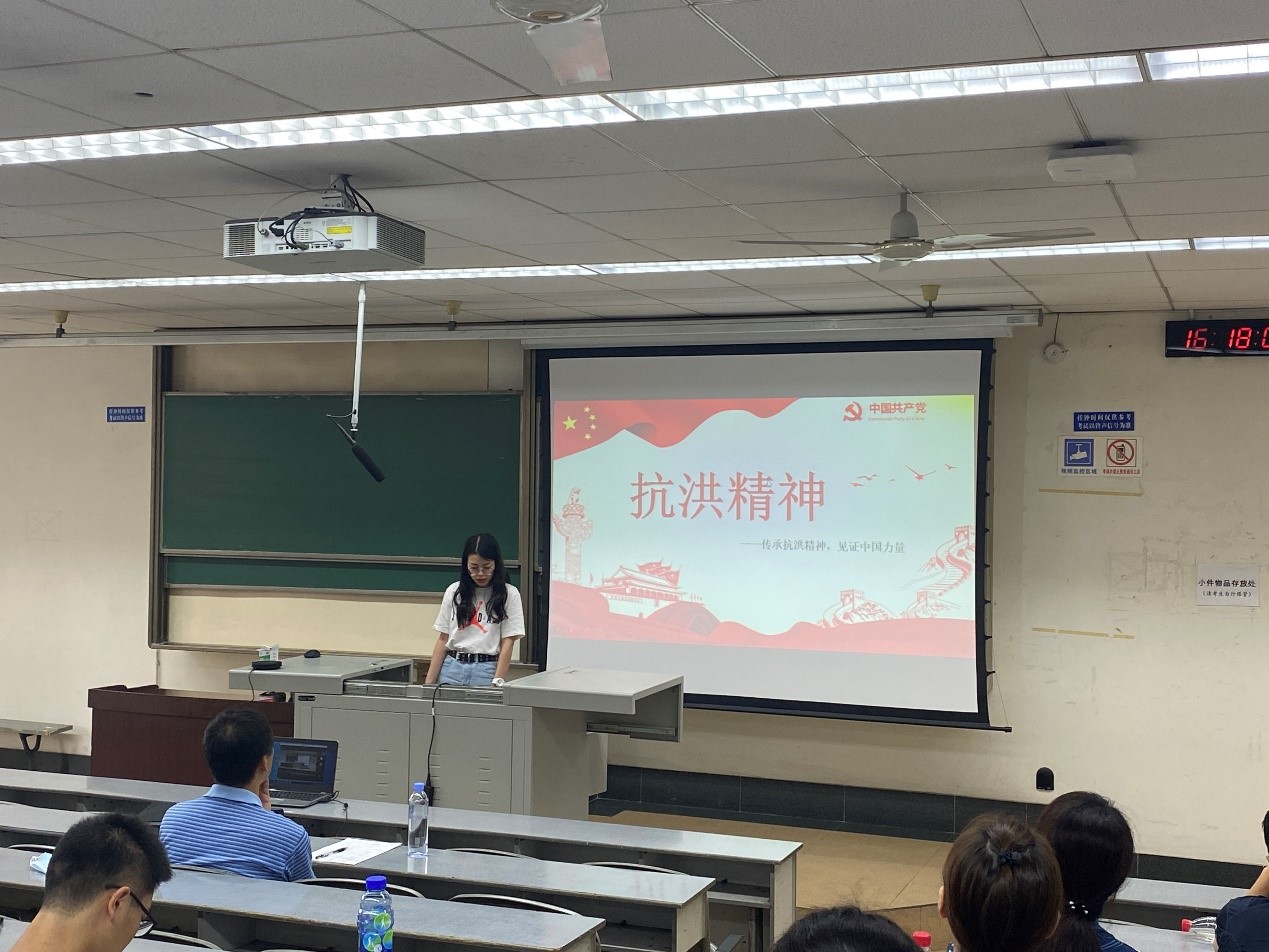 临床2020党小组杨雪同志从精神起源、精神内涵、精神意义三个方面展开分享了抗洪精神。“在同洪水的搏斗中,我们的民族和人民展示出了一种十分崇高的精神。这就是万众一心、众志成城,不怕困难、顽强拼搏,坚韧不拔、敢于胜利的伟大抗洪精神。”抗洪精神是在抗洪抢险斗争中凝聚起的伟大精神力量,它不只产生于这一次抗洪抢险斗争,还根植于我们改造自然和社会的伟大实践中,根植于我们党、政府和军队全心全意为人民服务的宗旨中。每当中华民族遇到重大困难和障碍的时候,抗洪精神已成为我们战胜各种困难、扫除各种障碍的重要精神资源,鼓舞着中国人民战胜各种艰难险阻,不断前进。