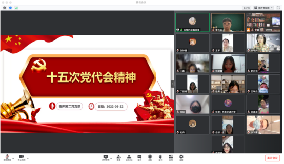 2022年9月22日晚8时,临床第二党支部通过腾讯会议于线上召开了本周的党支部集中学习会。本次学习会由支部书记张雪同志领学,全体党员参加,会议分为两个议程,第一个议程为学习万象城awc官网登录入口第十五次党代会精神,第二个议程是支部工作法的学习与讨论。